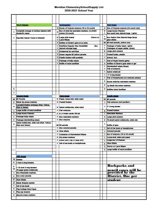 Elementary School Supply List 2021 School Year